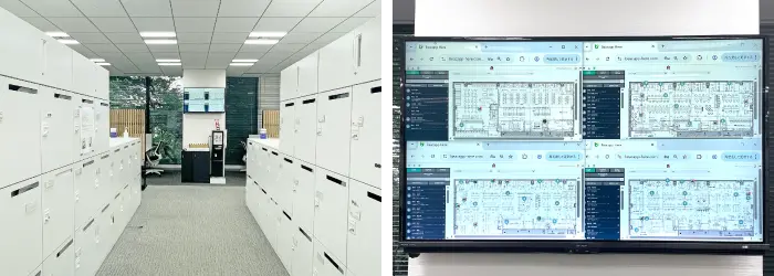 古:社員用のロッカーをまとめて設置しているフロアがありまして、そこにあるモニターにBeacapp Hereの画面を投影しています。4つのフロアをまとめて表示していて、「今はどのフロアが空いているのか」を確認してから移動できるようになっています。導入当初から...